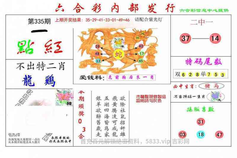 | 335期:天地+二肖〖地肖+猪猴〗开:狗44准 |